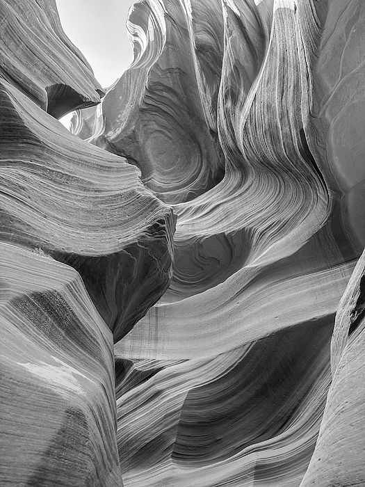 Winding rock formations in Lower Antelope Canyon create a mesmerizing pattern in monochrome. The play of light and shadow highlights the intricate... more